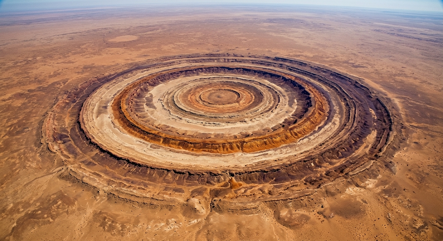 From orbit, it's unmistakable: a massive bull's-eye of concentric rings carved into the flat brown emptiness of Mauritania, so perfectly geometric it looks designed. The Richat Structure—better known as the Eye of the Sahara—stretches roughly 28 miles across, wide enough to swallow a major city. Astronauts use it as a landmark. And for decades, nobody could explain what it was.