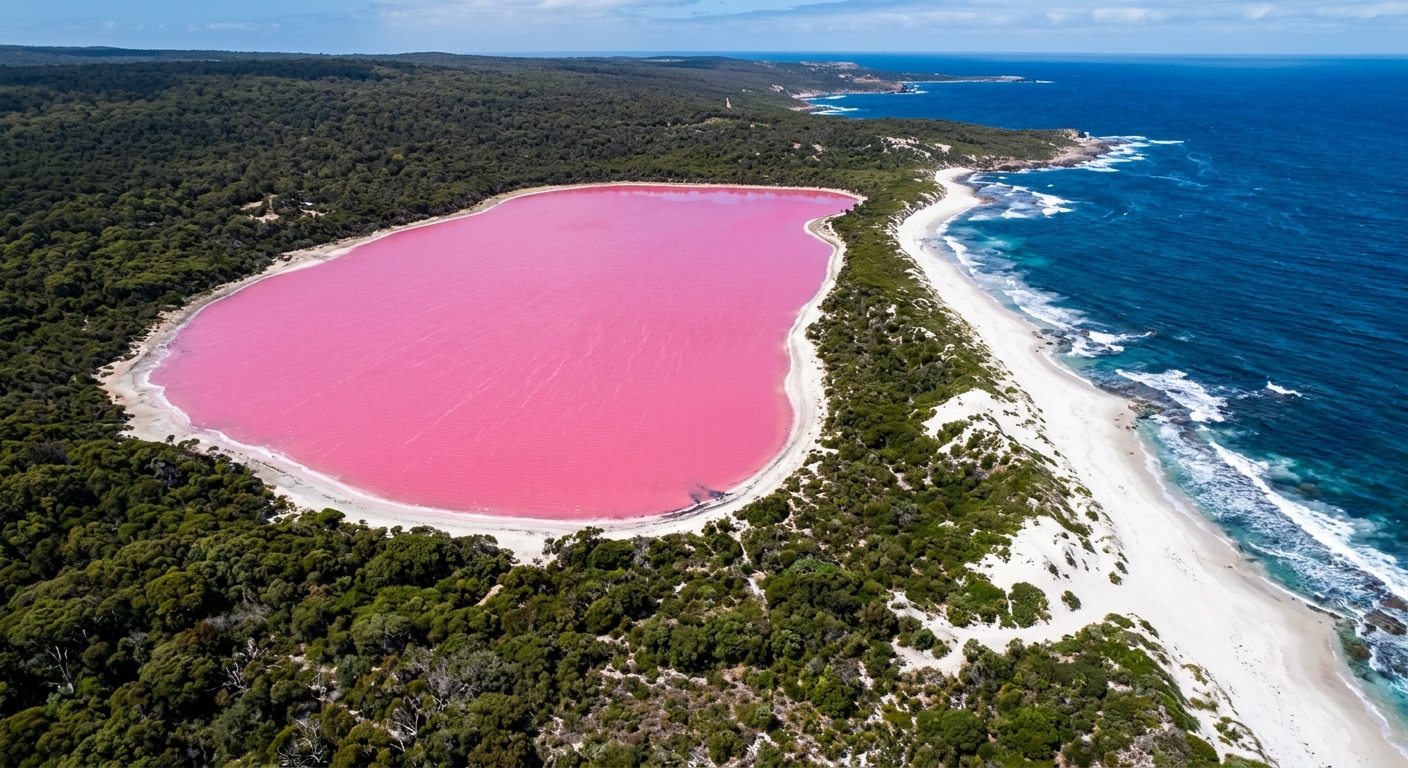 Lake Hillier is pink. Not "sort of salmon in the right light" pink. Bubblegum pink. About one-third of a mile long, it sits just inland from the coast. From the air, you get the full, absurd contrast: a bright, opaque rose pool separated by a thin ribbon of sand and vegetation from the deep, moody blue of the ocean. It looks like someone spilled a cosmic smoothie on an otherwise respectable coastline.