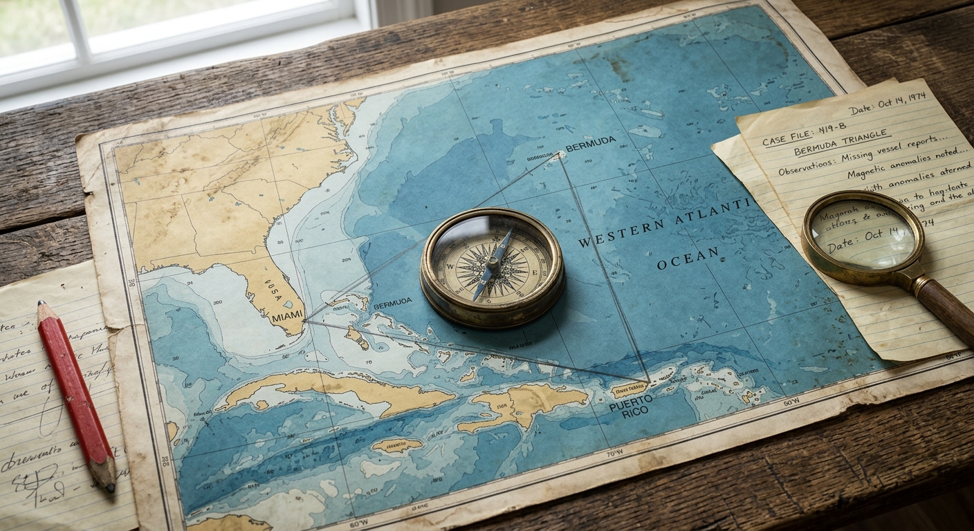 He crossed to the desk and jabbed a finger at a map. "The region in question: a rough triangle connecting Miami, the island of Bermuda, and Puerto Rico. Perhaps 500,000 square miles of Atlantic Ocean. No official maritime boundary, no governing body, no formal designation—just a name that has somehow convinced the world it is a place where physics takes a holiday."
